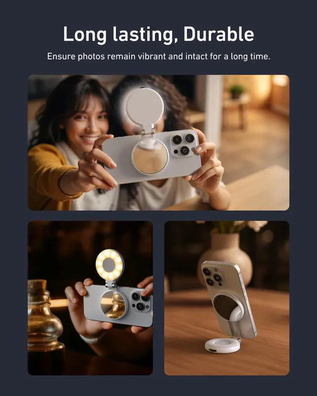 - [Phone Stand Options]This phone light can be fixed on the back of your phone to help you take a selfie or take beautiful photos or videos. Not just a light: A phone stand conference halo vanity mirror ambiance creator. We know you deserve more than utility it's about the ritual of being beautifully seen, every single used