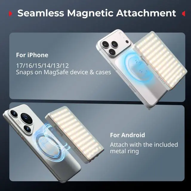 SmallRig M3 Attachable Mobile Phone LED Video Light (Ink Blue) 5505 offers versatile mounting solutions with magnetic compatibility for instant attachment and detachment. It works seamlessly with magnetic-enabled for iPhones or pairs effortlessly with Android devices using the included metal ring achieving secure mounting in just one second! Additionally, it features a clip-on quick release base that enables horizontal or vertical mounting on monitors or laptops within seconds, complete with 170° tilt adjustment for perfect positioning ensuring tool-free installation and hassle-free lighting setup.