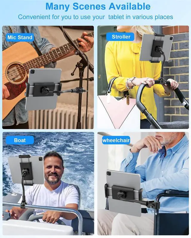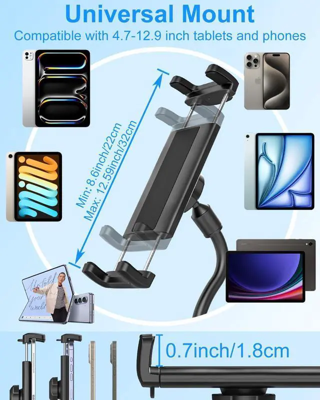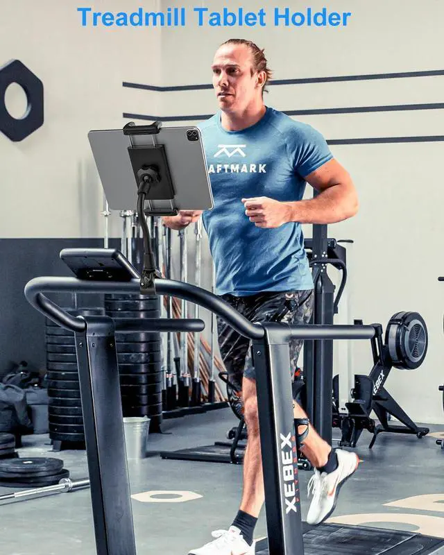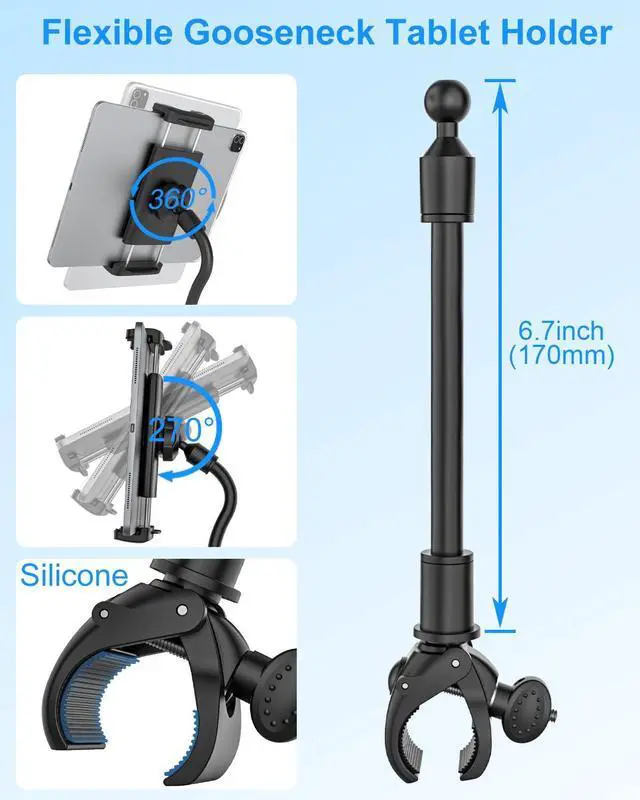 Kolasels Gooseneck Tablet Holder for Spin Bike, Stationary Bicycle, Wheelchair, Treadmill, Indoor Bike, Peloton, Elliptical, Tablet Mount Clamp for iPad Pro, Air, Mini, Galaxy Tabs, 4.7-12.9" Tablets