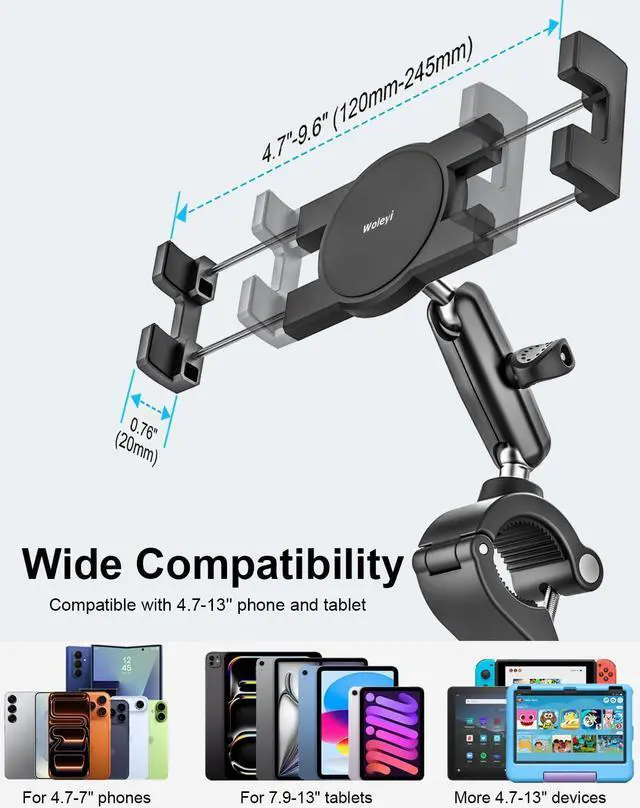 • [Devices Compatibility]The universal handlebar tablet holder is suitable for 4.7 - 13" tablets and phones, such as 2025/ 2024/ 2022 iPad Pro 13 inch, Pro 11, iPad Air 6, iPad Mini, Galaxy Tab, Galaxy z fold, Fire HD, iPhone Air, iPhone 17 Pro Max, 16, 15, 14, Galaxy S25 Ultra, e-Readers etc more tablets and smartphones with or without a case or sleeve. Suit for 4.7 - 13 inches devices is refers to the length of the device diagonal, not the device's width.