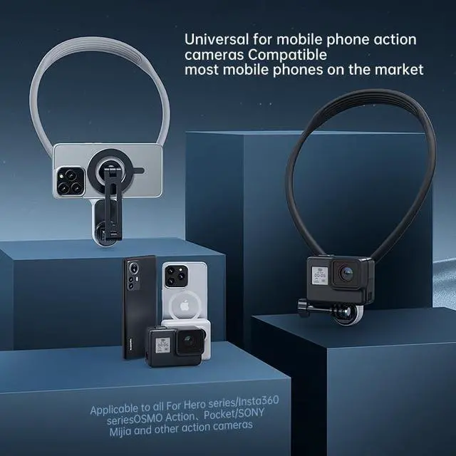 Designed to fit most smartphones and action cameras on the market, this neck holder is compatible with an extensive range including Go Pro Hero series (Hero 12, 11, 10, 9, 8, 7 Black Max) and various i Phone models (i Phone 16 series, 15 series, 14 series, 13 series, and 12 series). For phones with weaker magnetic attachments, two magnetic rings are included to enhance compatibility with smartphone cases.
