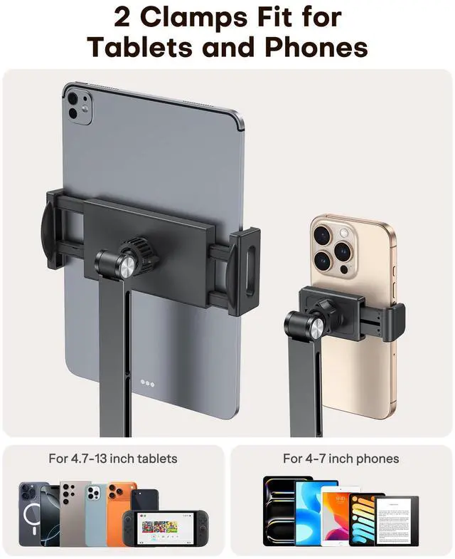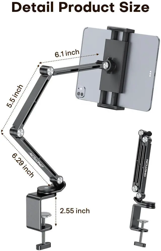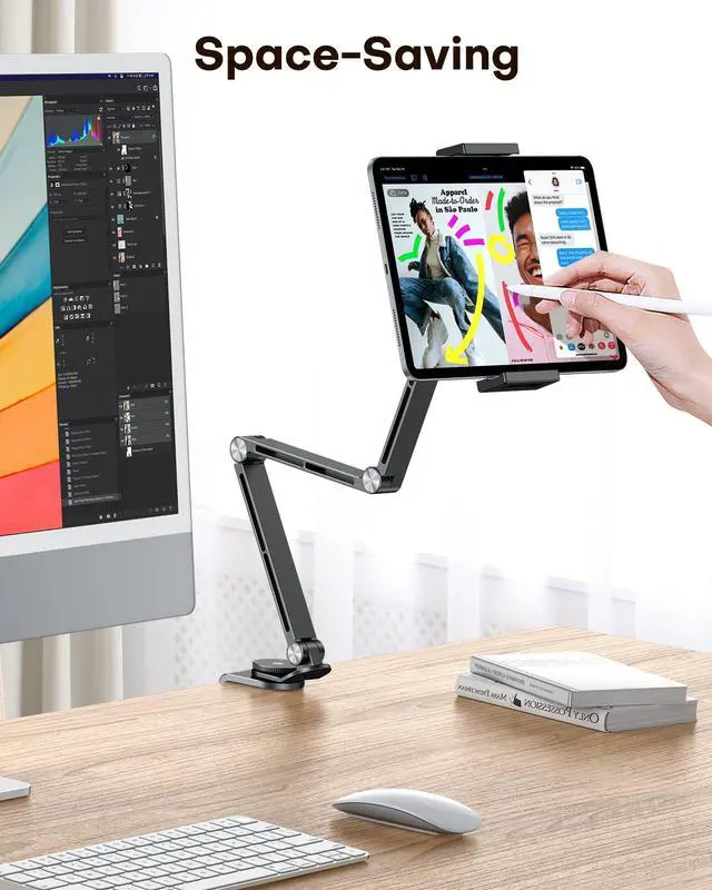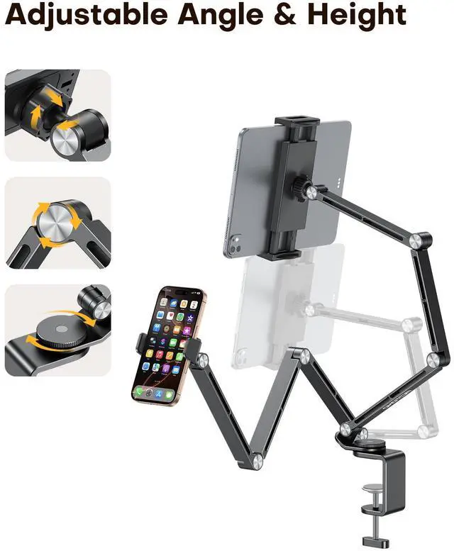 "Meet the ultimate solution for hands-free viewing. This versatile tablet & phone holder is engineered to provide the perfect viewing angle for any activity. Whether you're working from home, relaxing in the kitchen, or enjoying a movie in bed, this stand delivers unparalleled convenience and stability. Total Viewing Freedom: The adjustable head offers 360° rotation and multi-angle tilt, allowing you to position your iPad stand in portrait or landscape for the most comfortable view. Universal Compatibility: Strong and secure, this iPad stand for desk reliably holds everything from your largest tablet to your smartphone and e-reader, making it the only phone holder you'll ever need. Space-Saving Clip Design: The powerful clamp securely attaches to various surfaces like desks, countertops, and bed frames, saving valuable desk space and offering stability without marks. Foldable & Portable: Designed to be compact and foldable, this stand is easy to pack and carry, transforming any location into your personal entertainment or workstation. Perfect for Every Scenario: Home Office & Study: Clip this tablet holder to your desk for stable video calls, online classes, or following tutorials, reducing neck and arm strain. Kitchen & Dining: Securely mount your device on a countertop to watch cooking videos or follow recipes with messy hands. Bedroom & Living Room: Attach the stand to a bedside table or use it on a coffee table for comfortable movie streaming, e-book reading, or gaming. On The Go: Its lightweight and foldable nature makes it an ideal travel companion for mobile entertainment or work in hotels or temporary spaces."