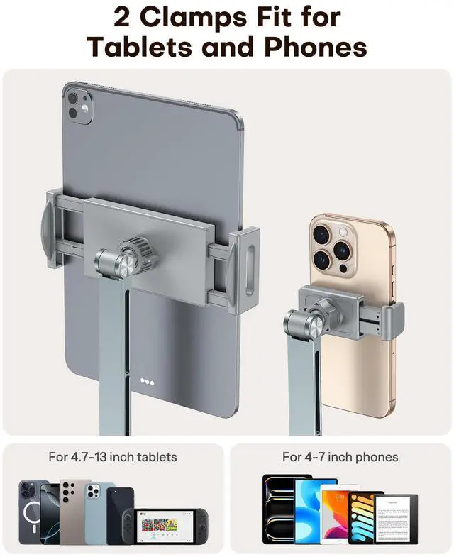 • Dual-device Compatibility & Secure Grip: Equipped with 2 robust clamps, this versatile phone holder securely mounts both your tablet or phone (4-13 inches). Perfect for iPad Pro, Mini, Air, Samsung Galaxy Tabs, iPhone series, Kindle, and more. No need to remove your protective case.