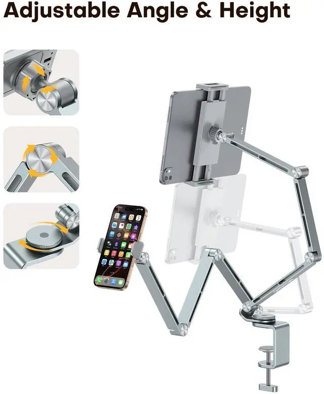 • Premium Aluminum Alloy Construction: Crafted from high-density, sleek aluminum alloy, this table holder stand offers unmatched stability, durability and a sophisticated aesthetic. Enjoy a rust-resistant, fade-proof design that securely supports your devices without wobbling.