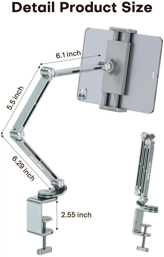• This iPad desk mount is constructed of aluminum ally arm and two plastic clamps. The purpose of using plastic clamps is to protect your devices from damage.