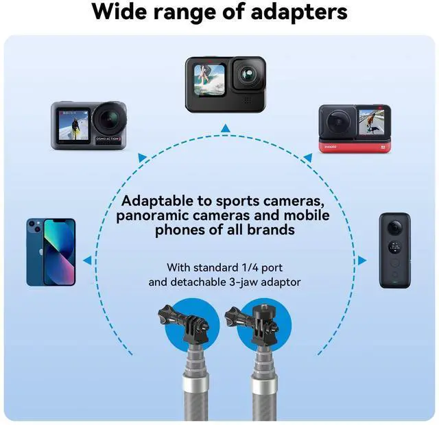 GoPro Max, Hero 13, Hero 12, Hero 11, Hero 10, Hero 9, Hero 8, Hero (2018), Hero 7 Black/White/Silver, Hero 6, Hero 5 Black, Hero 4, Hero 3, Hero 3+, Hero 2, Hero 1, Hero LCD, Hero Session 4, Session 5, Fusion, GoPro Omni VR360, EKEN H9, SJCAM, Garmin VIRB, Veho Muvi, Polaroid Cube(mount required), Nikon Keymission, APEMAN Action Camera, Canon PowerShot ELPH / SX420 / SX620 / 190, Sony (DSCW800), Sony W800/S DSC-W800/S DSCW800S, Sony DSCW800/B, Kodak PIXPRO , Sony DSCW830, Nikon COOLPIX A10, YI Lite 4K, Vemont, DBPOWER 4K, Dragon Touch 4K, EK7000 4K, Brave 4 4K, Dragon Touch 4K, ACT74, V50 Elite 4K, VanTop Moment 4 4K, Insta 360 One X, Amkov, Olympus Touch TG-Tracker, Sony FDR-X3000, Sony HDR-AZ1, TomTom Bandit, Nikon, Canon, Olympus digital compacts, DJI Osmo Action, DJI Osmo Pocket 2, DJI Action 2 , DJI Action 3, DJI Action 4, DJI Action 5, Dual-Screen Combo and Power Combo, Insta360 One R, Insta360 One X2, X3, Insta360 Go2 Ace Pro 2 and more