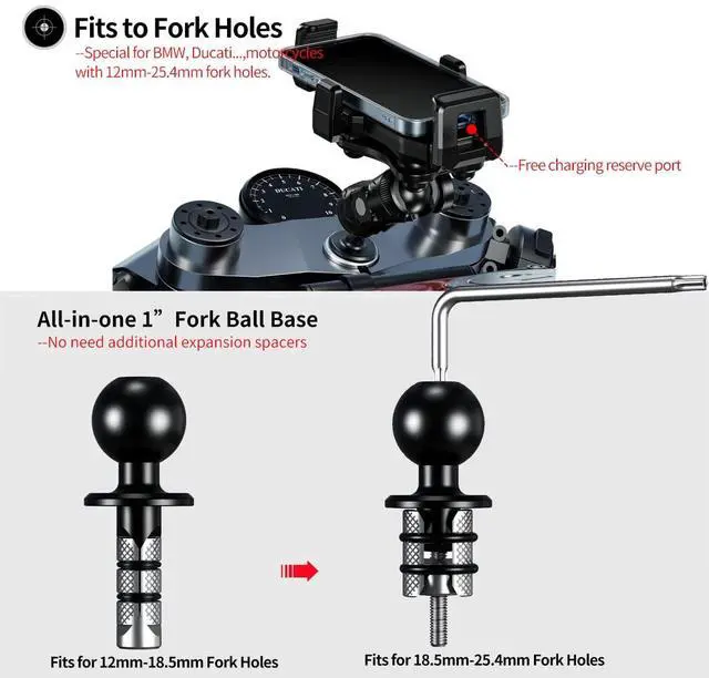 The 1 ball head fork stem base is specifically designed for cylindrical holes and comes with two metal pads suitable for 12mm-18.5mm-25.4mm/0.47"-0.73"-1" bar tube holes, making it suitable for BMW, Yamaha, Kawasaki, and other motorcycles. It can be easily operated with one hand, making it easy to take the phone on and off.