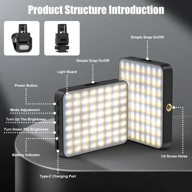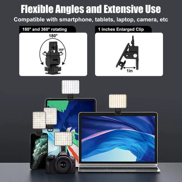 - [Versatile Compatibility] Our camera light is designed to enhance your photo and video quality, making it perfect for a wide range of devices including phones, tablets, PC, camera ect. It can be adjust the light and angle you want horizontally or vertically. 2.4cm extra-large clip opening ensures a secure fit to various devices, built-in non-slip silicone ensures that it won't slip out of place when in use.giving you the flexibility to use it wherever you go.
