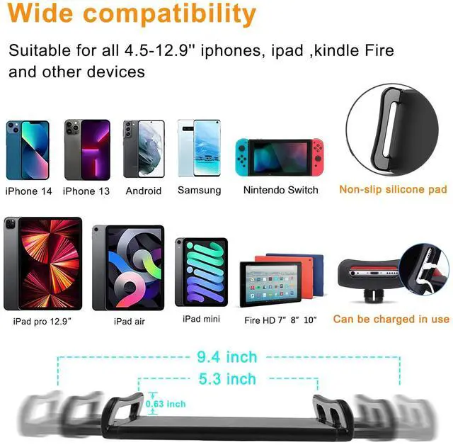 It works with various tablets and mobile devices ranging from 4.5 to 12.9 inches, including iPad mini, iPad, iPad Air, iPad Pro 12.9'', and many other tablets. For smartphones like iPhone7, 7plus, 8, 8plus, x, XR, xs, xs max, iPhone 11, 12, 13,14 series.Galaxy Tab,Fire 7, Fire HD 8, Fire HD 10, N- Switch and etc.