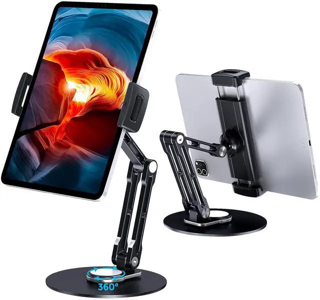 - The 360° rotating base and tablet holder combined with a folding arm offers fitting adjustment for typing or showcasing without missing any viewing angles.