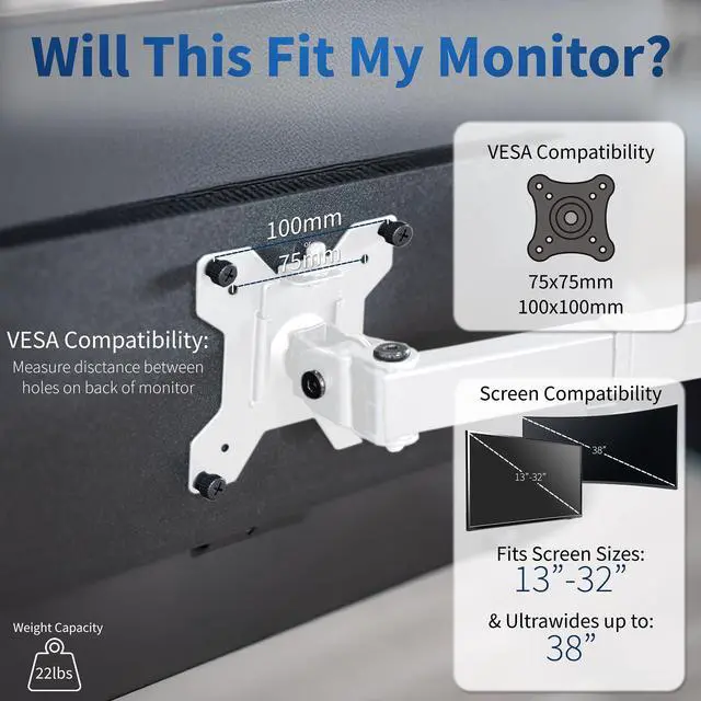 • Screen Compatibility - This single-arm mount fits screens that weigh up to 10 kg with backside mounting (VESA 75x75mm or 100x100mm). This covers most monitors on the market between 13" and 32", as well as ultrawide monitors up to 38".