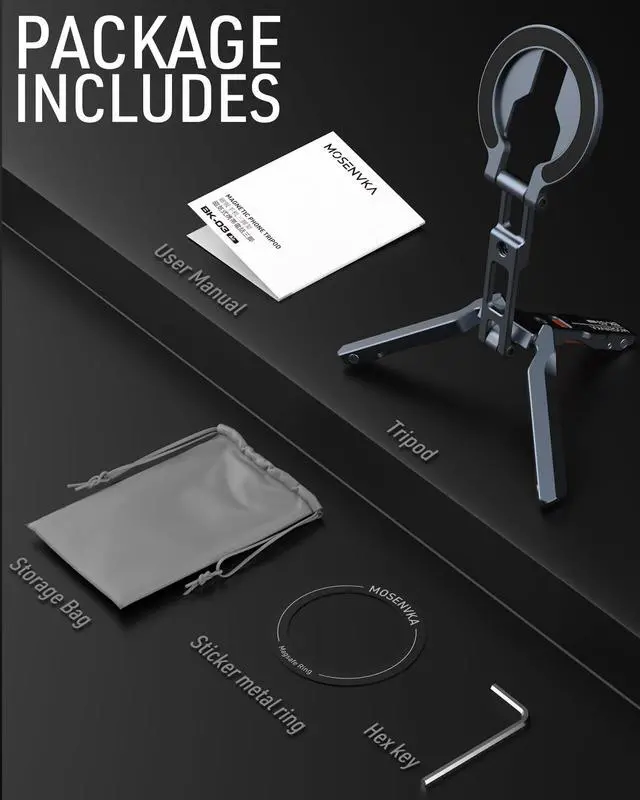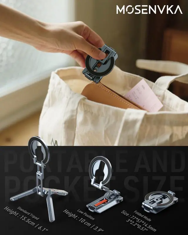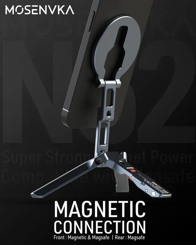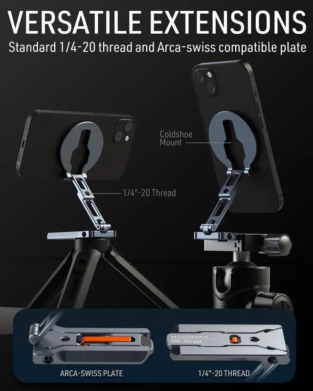 MOSENVAK mini magnetic phone tripod (Bulit-in arca-swiss,1/4’’ screw hole,cold shoe mount,design with foldable hook) ,great companion for stability, convenience, and creativity in every scenario!
