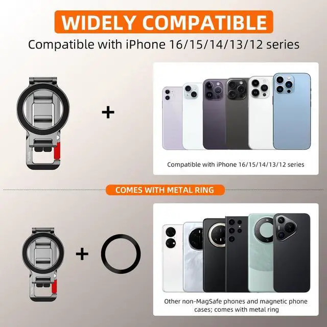 Magnetic ring light for iPhone 17-12 series. 3 color temps, stepless brightness, built-in mirror. Portable, rechargeable, with phone stand function. Black/White optional.