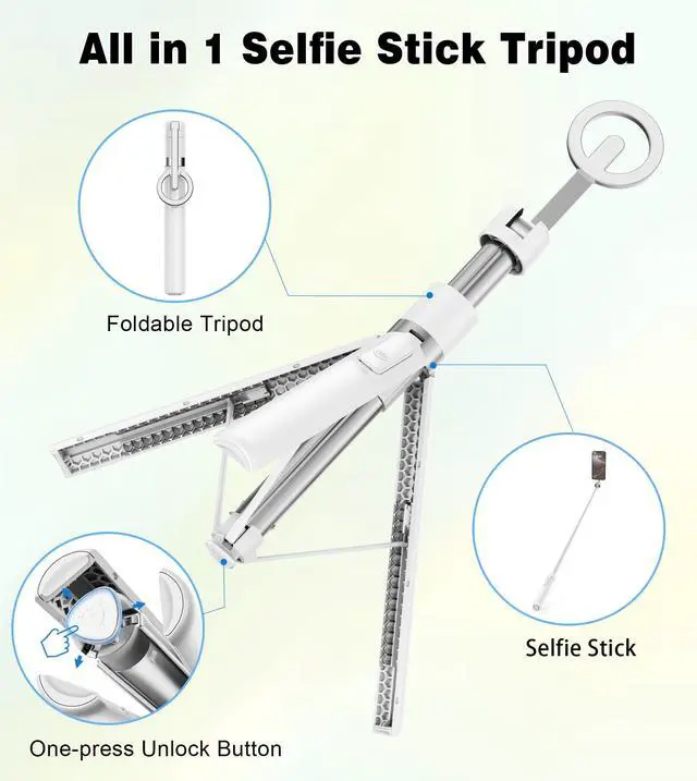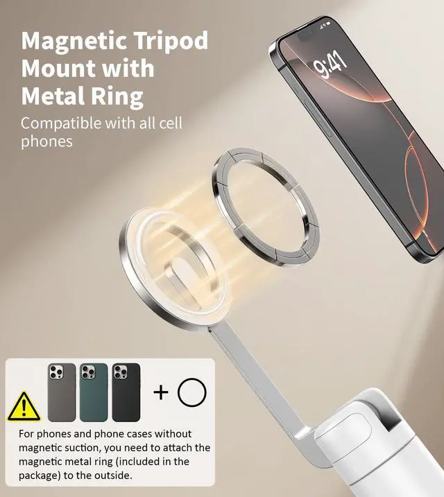 Note: Do not attach the magnetic metal ring to the inside of the phone case, as this may weaken the magnetic suction. (The metal ring cannot be attached to a leather case or silicone phone case.) Please do not use in windy conditions or on uneven ground, as the tripod may tip over.
