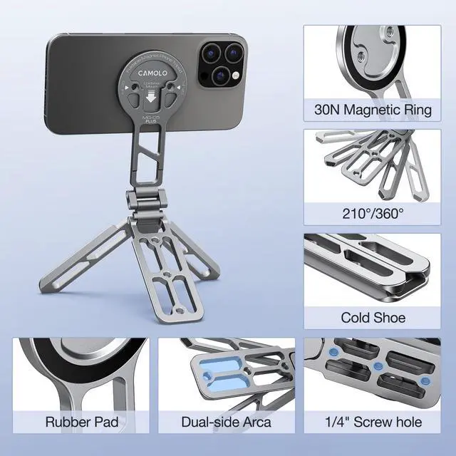 Arca Base Phone Tripod Mount Fold the split legs effortlessly convert into an Arca quick release plate, allowing rapid attachment to any tripod head with the identical mounting system. The pocket mount also boasts 1/4" screw holes & cold shoe for seamless integration with tripods, monopods, gimbals and more other systems.