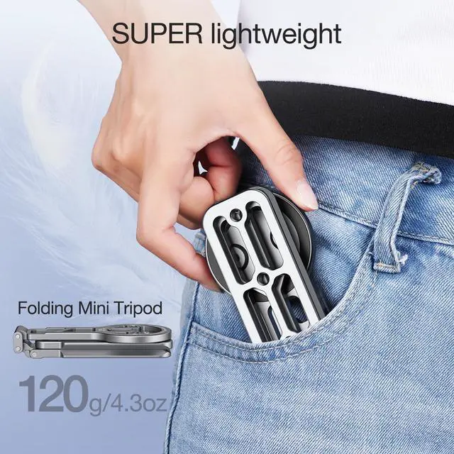 MG-05 PLUS Compact Tripod Stand the Phone Tripod Plus weights in at a mere 4.3ozlighter than your average smartphonepacks a punch without adding bulk. Storage size only 12cm/4.7in, smaller than a cell phone, ensures effortless pocketability, making it the ultimate companion for outdoor video adventures.