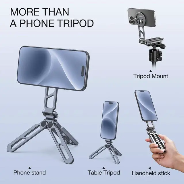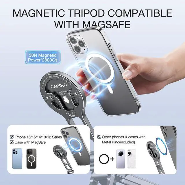 Perfect Compatibility Magnetic Tripod The Magnetic Compatible with iPhone 17/17 Air/17 Pro/17 Pro Max/16/16 Plus/16 Pro/16 Pro Max/15/15 Plus/15 Pro/15 Pro Max/14/14 Plus/14 Pro/14 Pro Max/13/13 Pro/13 mini/13 Pro Max/12/12 Pro/12 mini/12 Pro Max, official magnetic protective cases, etc. The magnetic metal ring included in the package can be attached to Compatible with iPad mini, iPhone 11 and below, Android phones, and cases for a MagSafe effect that keeps your phone completely steady and stable.