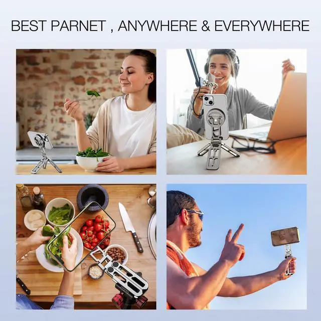 Perfect Compatibility Magnetic Tripod The Magnetic Compatible with iPhone 15/15 Plus/15 Pro/15 Pro Max/14/14 Plus/14 Pro/14 Pro Max/13/13 Pro/13 mini/13 Pro Max/12/12 Pro/12 mini/12 Pro Max, official magnetic protective cases, etc. The magnetic metal ring included in the package can be attached to iPhone 11 and below, Android phones, and cases for a MagSafe effect that keeps your phone completely steady and stable.