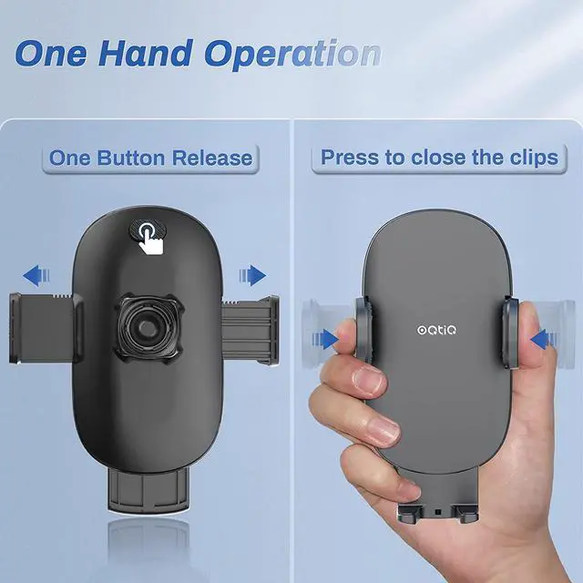 Quick One-Button Release: Effortlessly mount and remove your phone with the one-button release system. Simply press the release button on the back of the cradle, and the clamp arms will smoothly slide open.