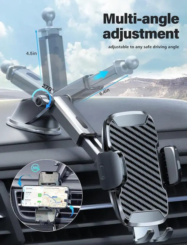 Long Arm Design and Multiple-view Angles: This phone stand has a telescopic arm that extends from 4.5" to 6.4" and can be rotated 270° for various angles to optimize viewing capabilities. And with a highly flexible 360° rotating spherical joint, it offers infinite viewing angles. Place your phone at the perfect corner and enjoy a more relaxed and safer driving experience.