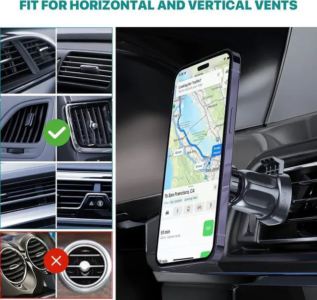 Secure and Stable Expert Vent ClipMiracase phone holder for car features a unique fall-proof locking design and upgraded metal hook that securely holds your phone in place, even on bumpy roads, the prime gadget is also easy to install and won't damage your air vent.