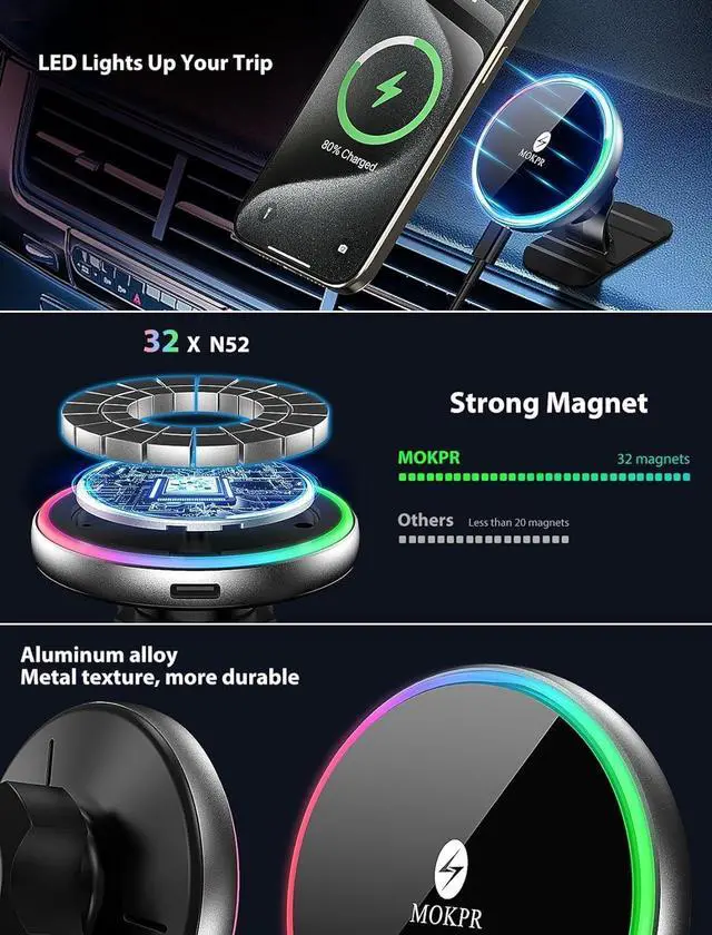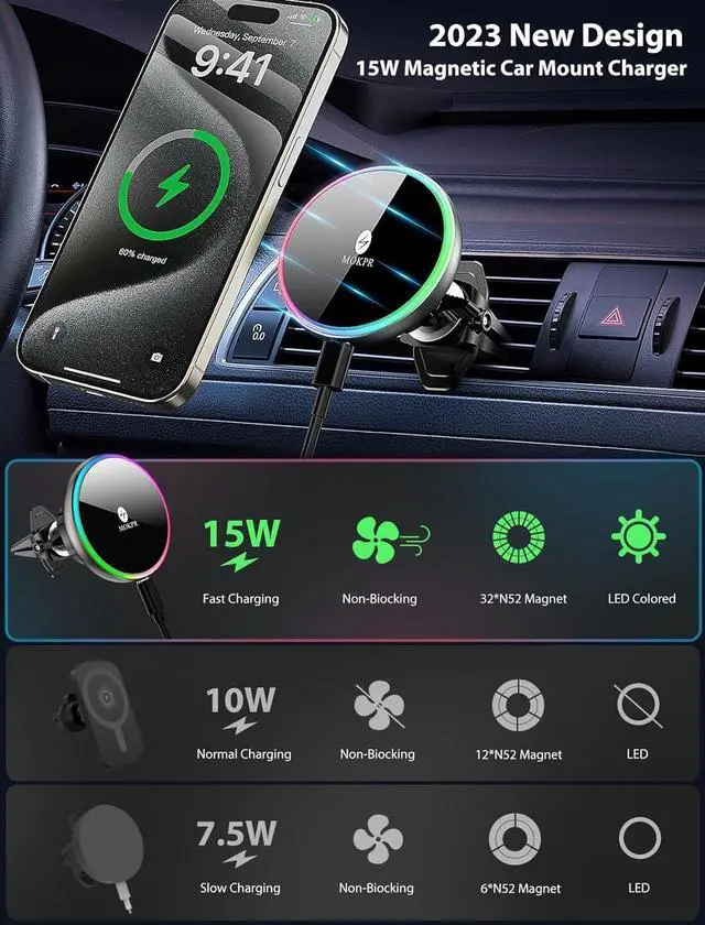 Magnetic CompatibleThe MOKPR magnetic wireless car charger only work with Apple iPhone 15/15 Pro/15 Plus/15 Pro Max, iPhone 14/14 Pro/14 Plus/14 Pro Max/14 Mini/13/ 13 Pro/ 13 Pro Max/ 13 Mini/ iPhone 12/ 12 Pro/ 12 Pro Max/ 12 Mini and certified Magnetic Cases