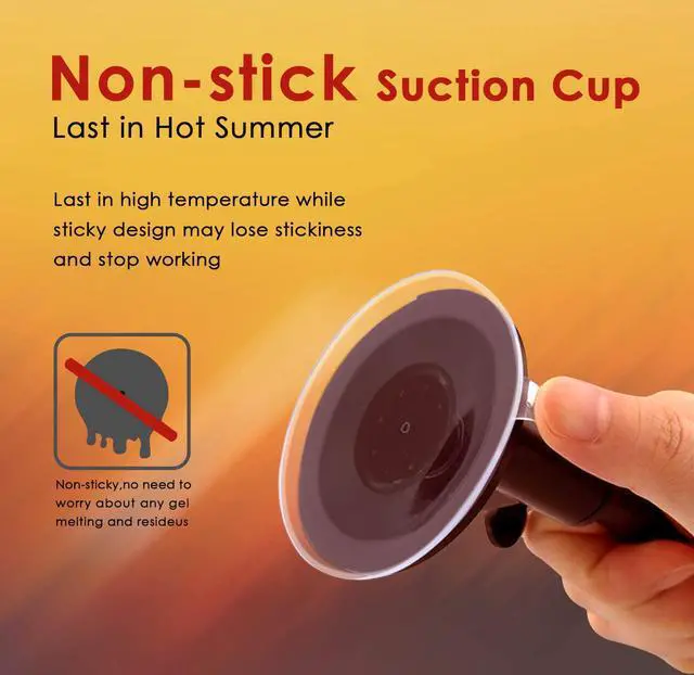 Note: It can't be used to car dashboard. The non-sticky suction cup can suck to windshield/glass sturdily as sticky one does. Whats more, it will work in hot weather, because its suction will last in high temperature while the sticky suction cup may lost stickiness and stop working.
