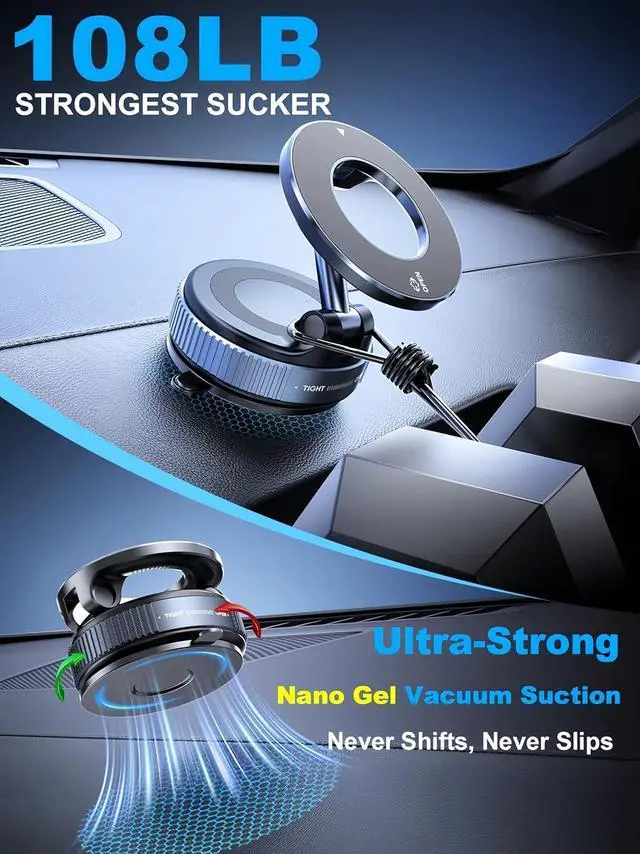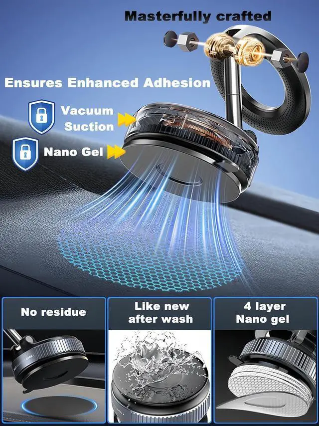 Strong SuctionThis vacuum magnetic phone holder features an upgraded 4-layer nano gel suction base with rotary vacuum-seal technology. Simply twist the dial to secure it firmly on flat surfaces like leather dashboards, windshields, center consoles, or side windows. Delivers 80% stronger hold than traditional push-style mounts, staying rock-solid even on bumpy roads. (Pro tip: Rinse the suction cup with water to restore its original grip if adhesion weakens).