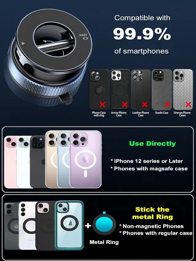 Universal CompatibilitySleek 2025 magnetic car phone holder for iPhone 16/15/14/13/12 Pro Max/Mini & for MagSafe Cases. Includes 2 adhesive metal rings for non-magnetic phones/cases. Compatible with all Android devices. For best adhesion, let rings cure 24 hours after application.