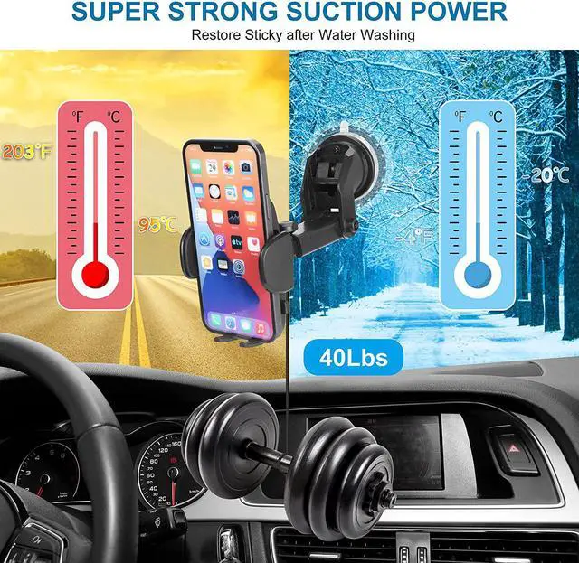 Military-Grade Suction Cup: The latest enhanced Adjustable phone holder car passed the military-grade sturdiness test! Adopt 2-level locking mechanism, absolutely 2 times stronger than ordinary suction! The suction cup can withstand the temperature from -20-4°F) to 95/(203°F), and work well in extreme weather, Only need to rinse with water to restore the stickiness.