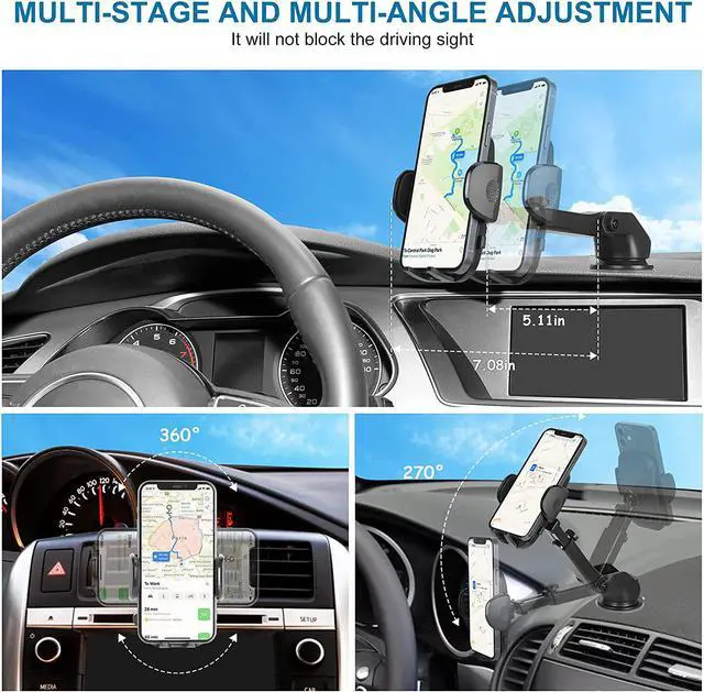 Long Arm Design & Multiple Viewing Angle: The car cell phone holder has a telescopic arm that extends from 5.11" to 7.08" and can pivot up or down for a variety of angles. This car mount for iphone has a highly flexible 360-degree rotatable head that provides you with the best viewing angle to keep your phone always in view - and ready for any hands free calls, GPS navigation & music streaming. No need to lower your head or distract you while driving.