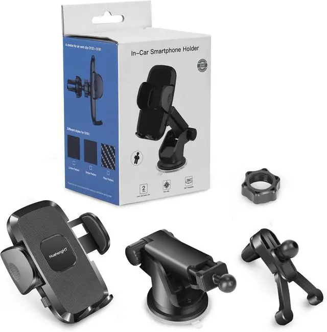 Phone car Mount Holder packageEach set has 1 Chucks, 1 x enhanced adjustable long arm suction cup, 1 Triangular Air Vent Clip.