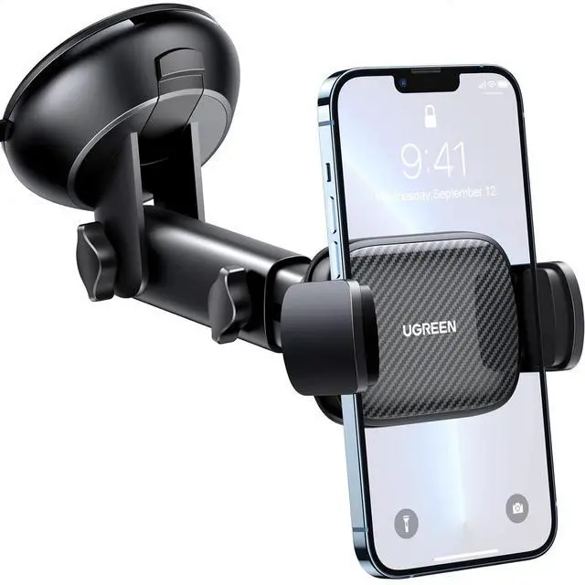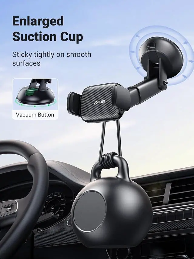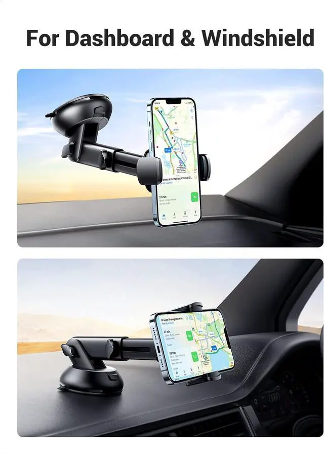 Strong Suction Dashboard Car Phone holder, can firmly be attached to the dashboard, windshield, office desk, kitchen counter, or most smooth, flat surfaces. It will hold 4.7 - 7.12 inch devices securely via the clamp of this car mount. Never worry about falling off even on bumpy roads, sharp turns, or emergency braking. This car phone holder needs to be installed and used on a smooth and flat surface