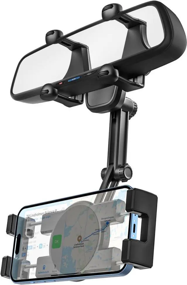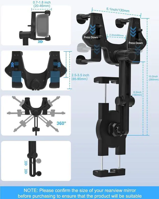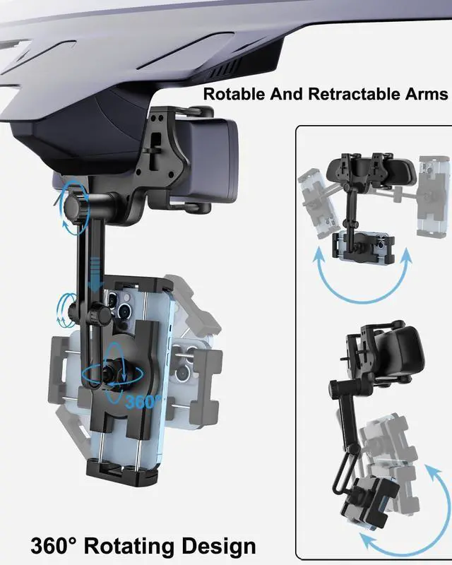 Rotable And Retractable ArmsThis rearview mirror phone holder has a flexible structure. The main arm can rotate in a 180 degree arc and also freely retract, making it easy to adjust the angle and height according to the driver's field of view. The bottom of the arm is also designed with a ball head that can rotate 360 degrees, allowing you to easily rotate your phone to a horizontal or vertical view.