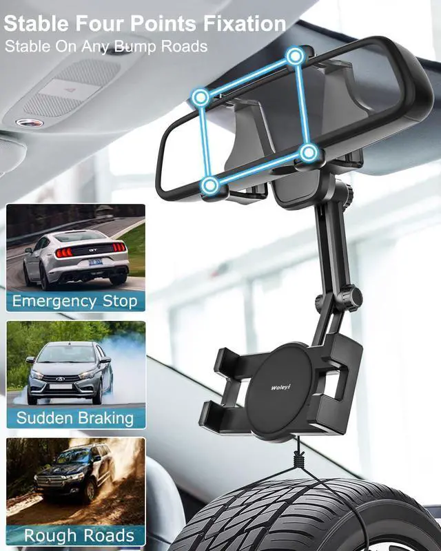 Stable Four Points FixationAdjustable four points fixation design are suitable for various thicknesses of car rearview mirrorsthickness from 20mm to 46mm. The contact surface between the points and the rearview mirror has soft anti-skid and shock-absorbing sponge, which can keep your phone safe and stable even if you suddenly brake or drive on bumpy roads. In addition, these sponge pieces can also effectively protect the rearview mirror from scratches.