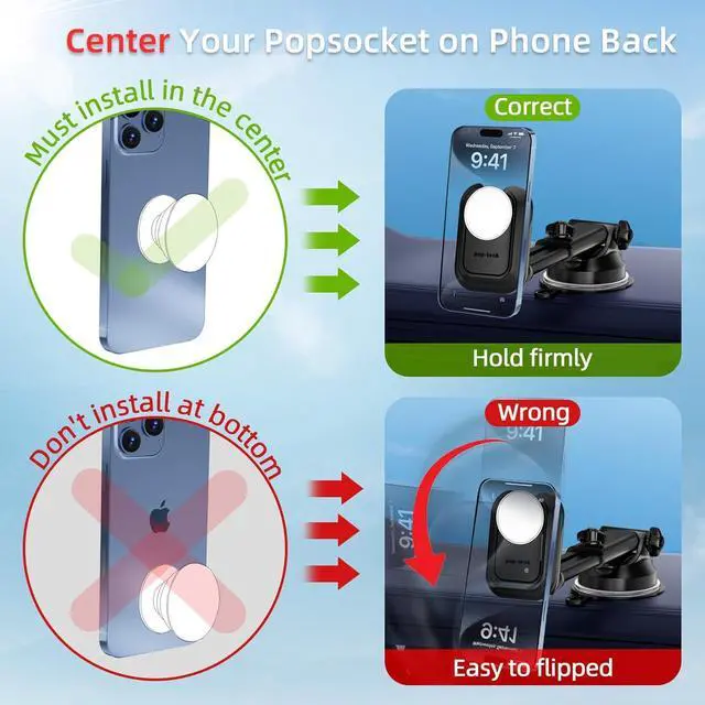 Strong Suction Cup: Our car mount for pop socket uses a advanced 3-layer nano gel suction cup and 1-step locking mechanism. It creates a powerful double-lock vacuum effect, securely holding on dashboard and windshield. Just rinse with water to restore the stickiness