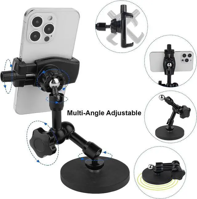 Multi-Angle Adjustment: Phone bracket arm has 3 ball heads, allowing to each end of ball head 90°tilt freedom by twisting joint knob, also twisting joint knob to lock end of ball heads, stainless steel ball head on top of bracket arm support phone clip 360°rotation flexible, it's convenient for user to capture best viewings of cellphone.
