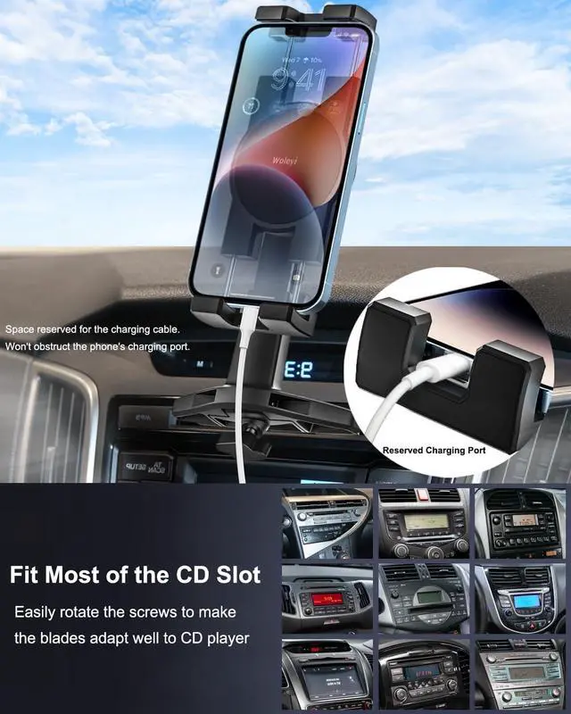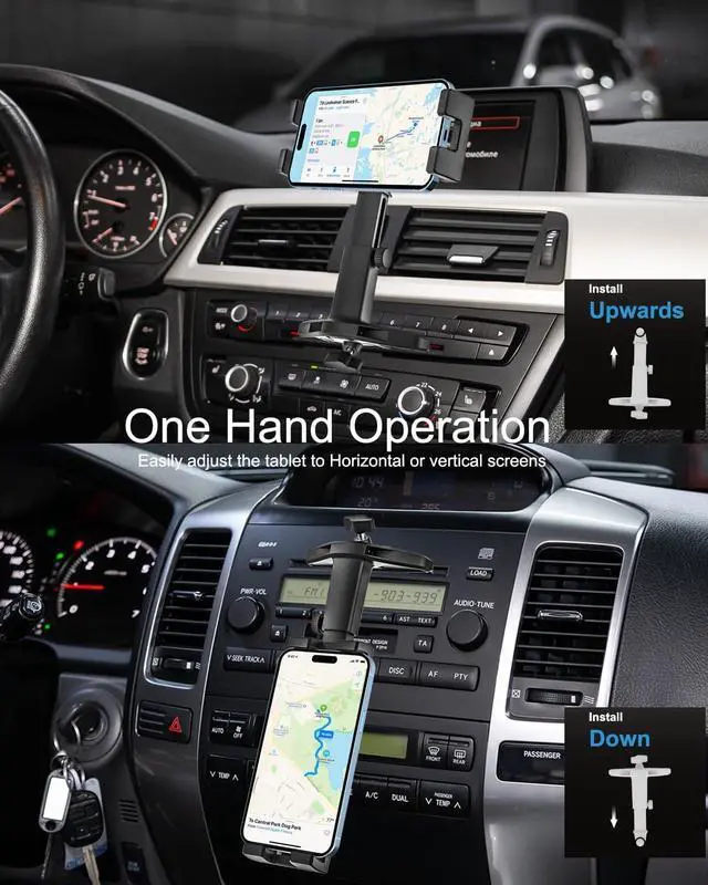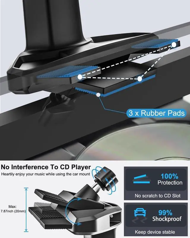 Friendly To CD BladesThe CD player car phone mount takes seconds to install. With this cell phone holder, completely releases your hands and allows you to focus on the road ahead. T-shaped screw fixation is convenient and fast without hurting your hands. Also the cd car mount base wont damage your CD slot due to the soft silicone pads on the balde. You can still listen to CDs with the mount installed. It will only make your driving more convenient without any other adverse.