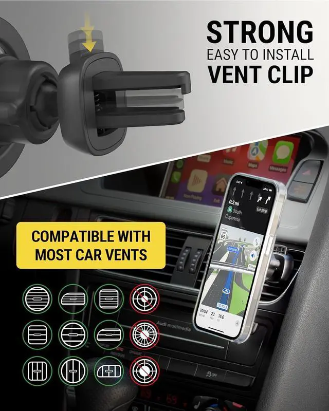 Strong Magnets: Secure your iPhone effortlessly with our MagSafe phone holder, featuring powerful Neodymium magnets for unmatched stability. Whether using the dash mount or the vent clip in your car vent, enjoy a seamless, reliable magnetic grip that keeps your device firmly in place