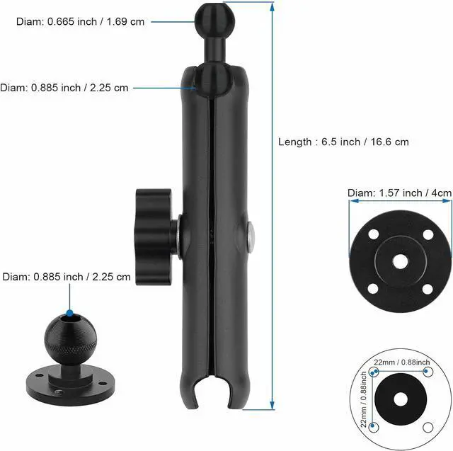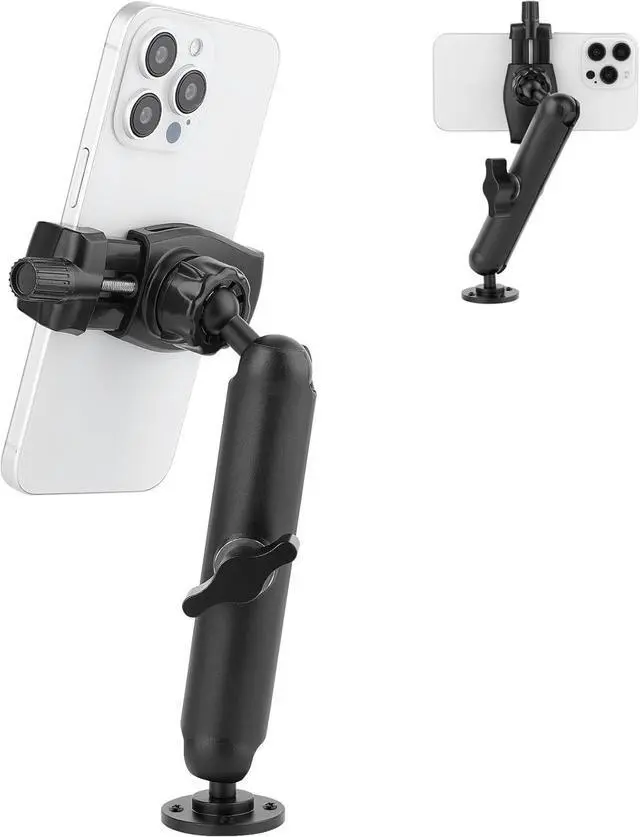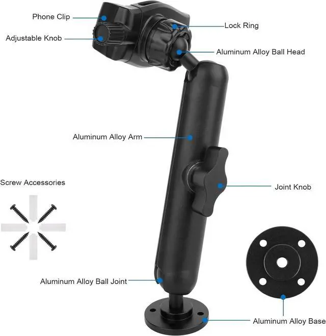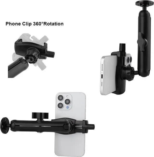 Flexible Adjustable: Two 0.885 inch ball joints can 180°rotation by twisting joint knob freedom, adjusting to angle of phone bracket arm, another one 0.67 inch ball joint be used to adjust angle of phone clip, it can 360°rotation to capture great viewing for customer.