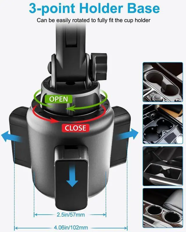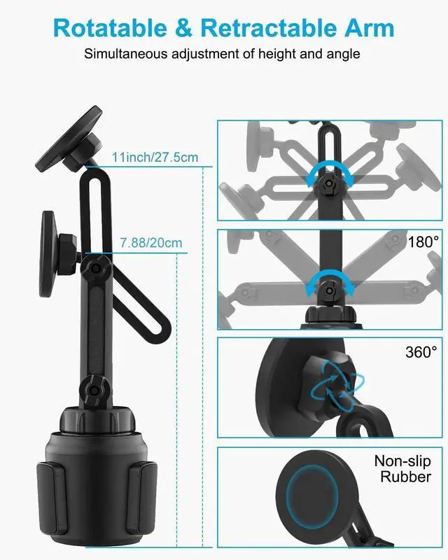 Two Section Adjustable Neck Features 360-degree ball head, two-section neck, three adjustable joints, the neck can be folded, and can be adjusted in height(max. up to 9''), and both section can be 270-degree rotated in an arc that further enhance your vision and operability, allowing you to adjust a perfect view angle and height, ensuring your safe driving all purpose car cup holder.