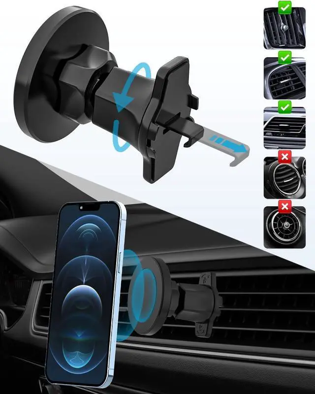 Easy Setup Cradle-less DesignThis magnetic mount is suitable for any model of phone or phone with a protective case. (Note: If it is the iPhone 15/14/13/12 series and certified Magsafe Cases, it can be directly placed on the car mount for use without any additional accessories). Besides, we have equipped additional metal 2pcs ring for other models of phones or non Magsafe phone cases, which are easy and fast to operate. We also provide a user manual for your reference.