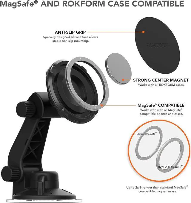 DUAL USE - The already popular Rokform suction cup mount has been redesigned to be compatible with MagSafe phones and cases in addition to all magnetic cases Rokform.