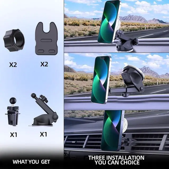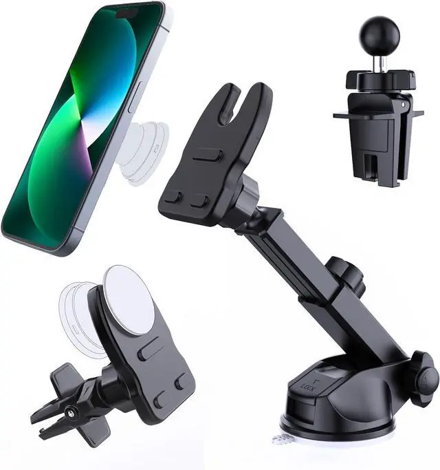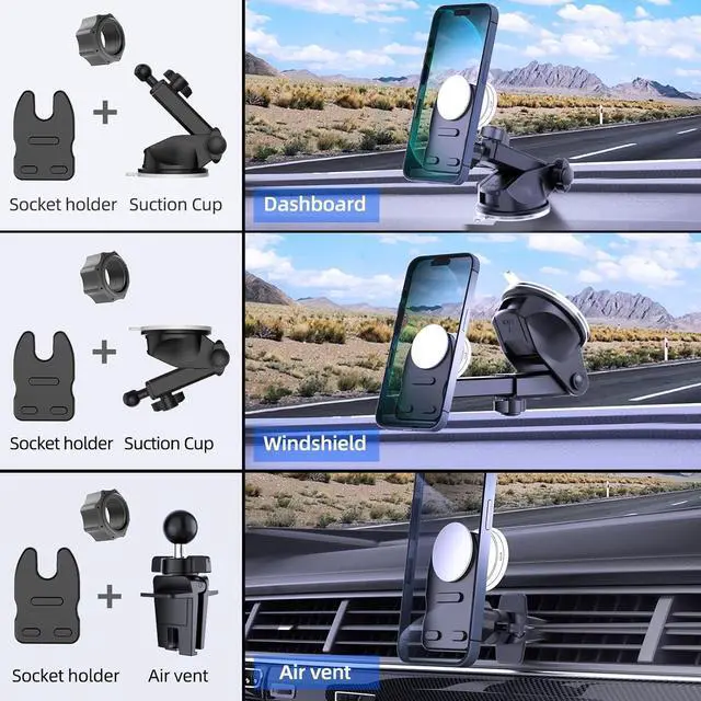 3 in 1 socket car mount: Car phone holder for socket grip with powerful suction and upgraded vent clip which provide you with the freedom to mount it on the dashboard, windshield, and air vents. It is suitable for all types of cars, including pickup trucks, suvs, trucks, and taxis and more.