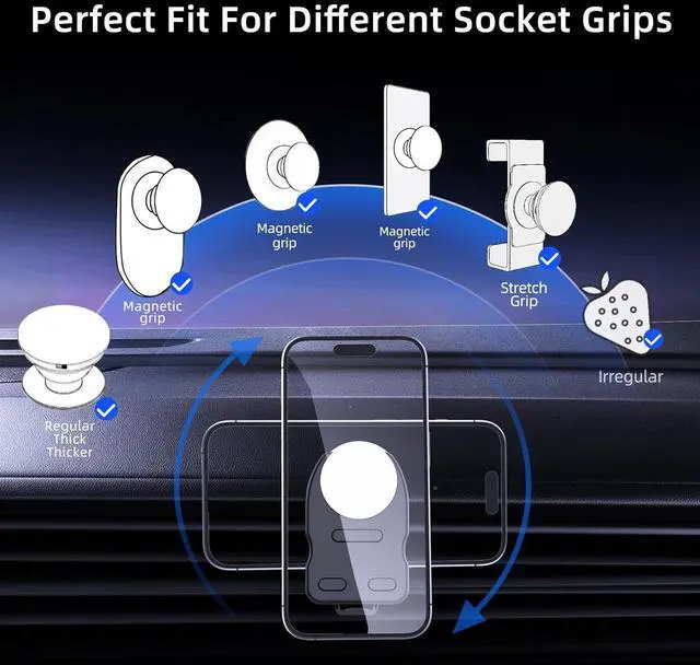 Compatible with most of sockets: Perfectly suitable for most socket grips in the market, different to those only for socket grips with thin and flat swapable tops, our upgraded double U-shape car phone holder fits for most collapsible socket grips, not only for basic version(Regular, thick, thicker), such as phone wallet ( credit card holder) with expanding grip, collapsible grip with magnetic, but not fit for mini socket grip and slide stretch grip.