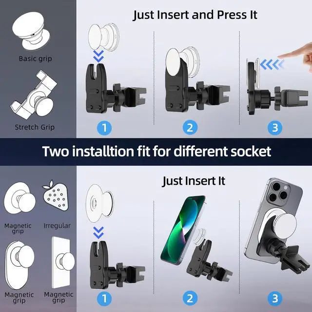 Easy to install: Put screw to the rotating swivel ball joint and connect to the socket car vent mount, car phone holder with suction cup. For Basic version socket, Just fully expanded your swappable socket and insert it into socket car mount, press the socket to fix it. For phone wallet (credit card holder) with expanding grip, collapsible grip with magnetic, just insert it into socket car mount for fix.
