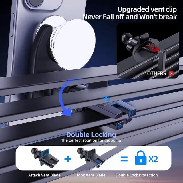 Powerful suction cup and Military Grade Clips: Three-layer nano-gel suction cups form a strong vacuum double lock with one click, up to 65 pounds suction force firmly grips the dashboard and windshield. Latest jagged design mounting vent clips with military metal, makes this socket car mount for car grip 99% air vents firmly, unique design forming 3-points support to ensure this air vent phone holder for car will not slip off when driving on bumpy roads, sharp turn.