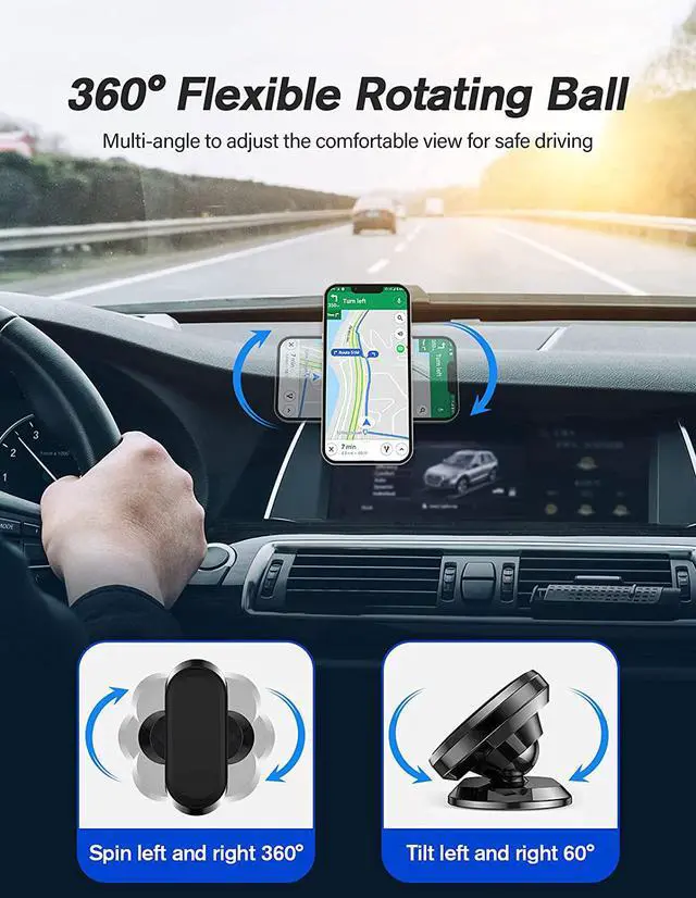 [360° Rotation and Easy Installation]: Magnetic Car Cell Phone Mount is portable accessories and only the size of chewing gum. It will not block any view when driving. Comes with 360-degree adjustable connector ball, adjust the angle of the phone at will.