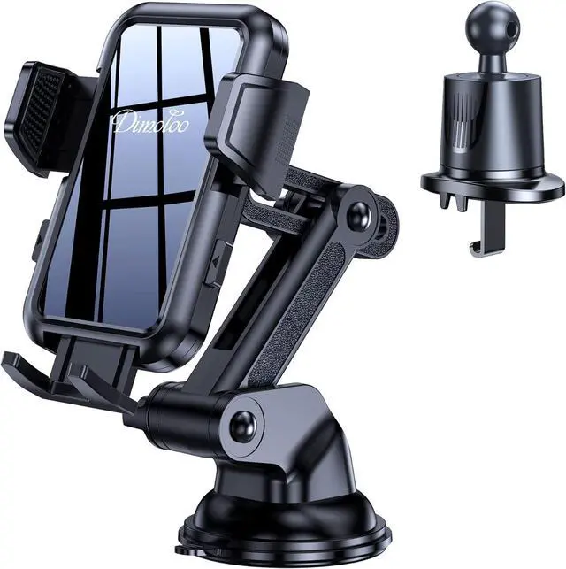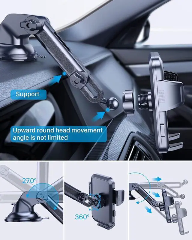 Dimoloo newest dash phone holder mount upgraded the long arm which makes it much more flexible (with 2 adjustable knobs) and longer(Up to 11") and can pivot up or down for a variety of angles which optimizes viewing capabilities. This phone mount for car dashboard has a highly flexible ball-joint 360° rotation that provides infinite viewing angles, so you can operate your phone comfortably and easily while driving.