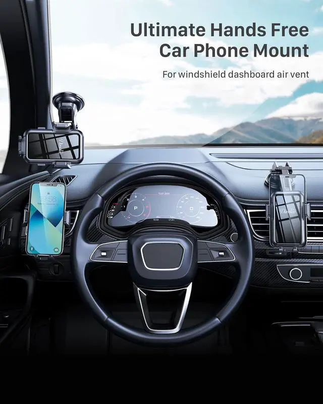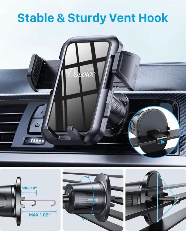 Phone holder with hook vent clip and strong sticky rotary lock suction cup can be used for dashboard/windshield/air vent/office. This cell phone car holders clip adopts the 2022 latest improved [twist-lock] triangle stable mode vent clip [Won't broken & Super Stable], and built-in metal that on bumpy roads, braking or driving can be firm enough to hold at the air vent.